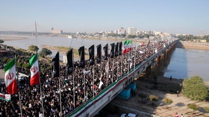 Τοποθετημένα στο σκέπαστρο φορτηγού στολισμένου με λουλούδια και καλυμμένου με ύφασμα που φέρει την απεικόνιση του Θόλου του τεμένους του Βράχου της Ιερουσαλήμ, τα φέρετρα με τις σορούς του Σουλεϊμανί και του Αμπού Μέχντι αλ-Μουχάντις, του φιλοϊρανού, ιρακινού στρατιωτικού διοικητή που σκοτώθηκε μαζί του, πέρασαν με μικρή ταχύτητα ανάμεσα από το πυκνό πλήθος που συγκεντρώθηκε για να θρηνήσει τον πιο αγαπημένο στρατιώτη του Ιράν στο κέντρο της πόλης Αχβαζ, σύμφωνα με τις εικόνες που μετέδωσε η ιρανική τηλεόραση.