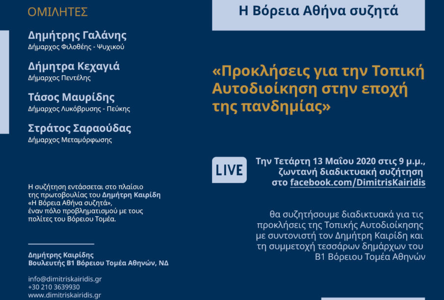 Η συζήτηση εντάσσεται στο πλαίσιο του κύκλου συζητήσεων του βουλευτή της Νέας Δημοκρατίας με τους πολίτες του βόρειου τομέα Αθηνών με τίτλο «Η Βόρεια Αθήνα συζητά» και θα πραγματοποιηθεί την Τετάρτη, 13 Μαΐου 2020 και ώρα 21:00, σε ζωντανή αναμετάδοση στη σελίδα του Facebook του Δημήτρη Καιρίδη – Δημήτρης Καιρίδης-Dimitris Kairidis και μέσω του καναλιού youtube.com/c/DimitrisKairidis .