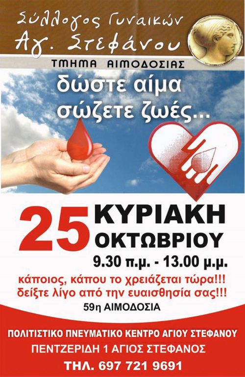 Αιμοδοσία του Συλλόγου Γυναικών Αγίου Στεφάνου, την Κυριακή 25 /10/20