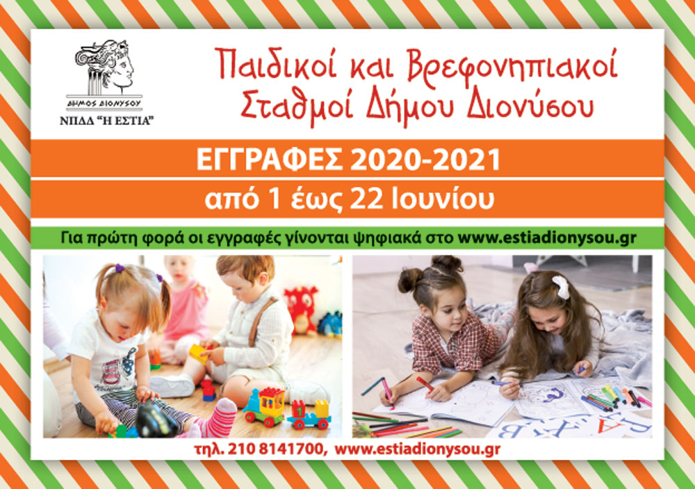Με χαρά σας ενημερώνουμε ότι ξεκινούν οι εγγραφές των νηπίων και βρεφών στους Παιδικούς και Βρεφονηπιακούς σταθμούς του Ν.Π.Δ.Δ ΚΟΙΠΑΠ ¨Η ΕΣΤΙΑ¨ του Δήμου Διονύσου, για τη σχολική χρονιά 2020-2021.