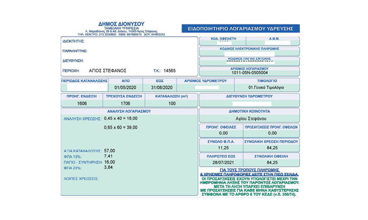 Ανακοίνωση του Δήμου Διονύσου για τις προσαυξήσεις στους λογαριασμούς ύδρευσης