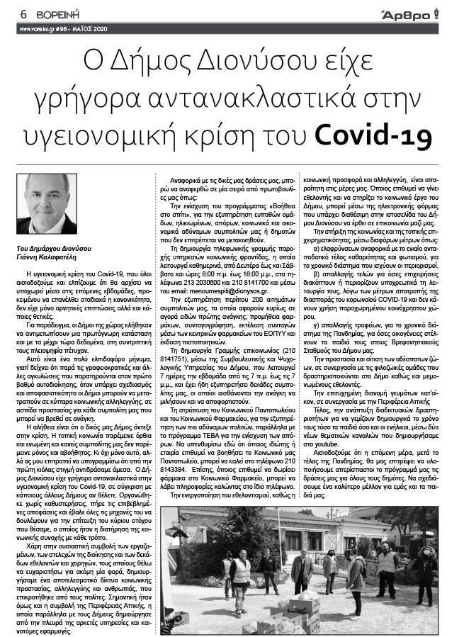 Γιάννης Καλαφατέλης: «O Δήμος Διονύσου είχε γρήγορα αντανακλαστικά στην υγειονομική κρίση του Covid-19»