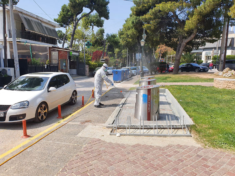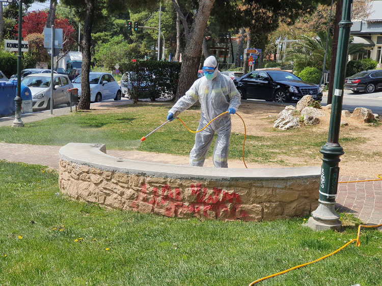 Τα ειδικά συνεργεία της Πολιτικής Προστασίας και της Διεύθυνσης Περιβάλλοντος απολυμαίνουν συνεχώς πλατείες, πεζοδρόμια, πεζόδρομους, δημοτικά κτίρια, κάδους απορριμμάτων, στάσεις λεωφορείων καθώς και άλλους κοινόχρηστους χώρους.