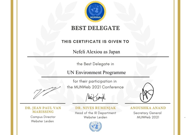 Ο Δήμος Διονύσου και η Αντιδημαρχία Παιδείας και Πολιτισμού συγχαίρουν θερμά τη μαθήτρια της Β΄Τάξης του Γυμνασίου Άνοιξης Ευτυχία Ελένη (Νεφέλη) Αλεξίου, η οποία κατέκτησε το 1ο βραβείο στο διεθνές forum MUN WEB21 (Conference hosted by the Webster Leiden Model United Nations Association).