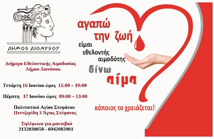 O Δήμος Διονύσου, διοργανώνει Διήμερο Εθελοντικής Αιμοδοσίας, το οποίο θα πραγματοποιηθεί στο Πολιτιστικό Κέντρο Αγίου Στεφάνου, στην οδό Πεντζερίδη 3 στον Άγιο Στέφανο, την Τετάρτη 16 Ιουνίου (απόγευμα από τις 15:00 μ.μ. έως 19:00 μ.μ.) και την Πέμπτη 17 Ιουνίου (πρωί από τις 9:00 π.μ. έως 13:00 μ.μ.) μόνο με ραντεβού.