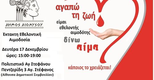 O Δήμος Διονύσου διοργανώνει Έκτακτη Εθελοντική Αιμοδοσία την Πέμπτη 17 Δεκεμβρίου 2020 ώρες 15:00 μ.μ. – 19:00 μ.μ. στο Πολιτιστικό Κέντρο Αγίου Στεφάνου, στην οδό Πεντζερίδη 3 στον Άγιο Στέφανο, η οποία λόγω των μέτρων κατά της πανδημίας θα πραγματοποιηθεί μόνο με ραντεβού.