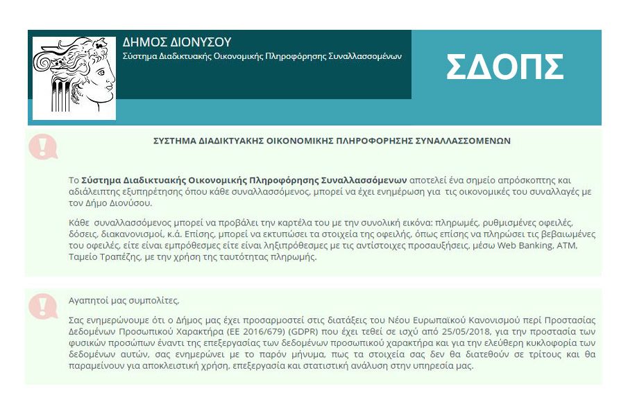 Ηλεκτρονικός Δήμος Διονύσου: Προσβάσιμο για όλους τους πολίτες το “Σύστημα Διαδικτυακής Οικονομικής Πληροφόρησης Συναλλασσομένων” (ΣΔΟΠΣ)