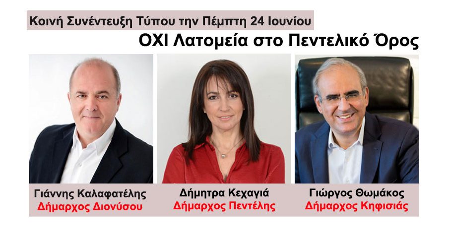 Κοινή Συνέντευξη Τύπου των Δημάρχων Διονύσου, Πεντέλης και Κηφισιάς την Πέμπτη 24/6, κατά της εγκατάστασης Λατομείων στο Πεντελικό Όρος