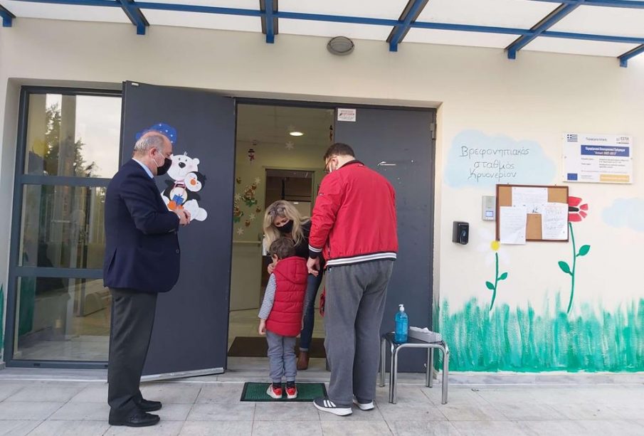 Ομαλά και χωρίς προβλήματα χτύπησε το πρώτο κουδούνι σε Δημοτικά Σχολεία, Νηπιαγωγεία και Βρεφονηπιακούς Σταθμούς του Δήμου Διονύσου τη Δευτέρα 11 Ιανουαρίου 2021, στο πλαίσιο της επαναλειτουργίας τους. ο Δήμαρχος Διονύσου Γιάννης Καλαφατέλης επισκέφθηκε μάλιστα τον Δημοτικό Βρεφονηπιακό & Παιδικό Σταθμό Κρυονερίου και είχε την ευκαιρία να συνομιλήσει με τον Πρόεδρο της ΕΣΤΙΑΣ Νίκο Κοκκαλά, εκπαιδευτικούς, γονείς αλλά και παιδιά, διαπιστώνοντας ότι όλα μέχρι στιγμής κυλούν σύμφωνα με το σχεδιασμό και με απόλυτη ασφάλεια για τα παιδιά.