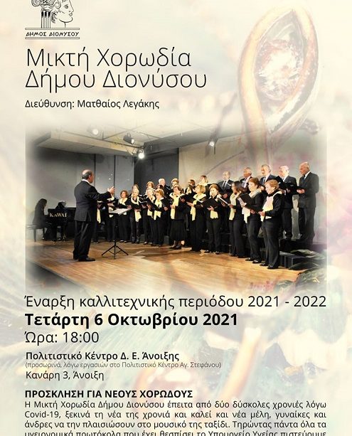 Η Μικτή Χορωδία Δήμου Διονύσου έπειτα από δύο δύσκολες χρονιές λόγω Covid-19, ξεκινά τη νέα της χρονιά και καλεί και νέα μέλη, γυναίκες και άνδρες να την πλαισιώσουν στο μουσικό της ταξίδι.