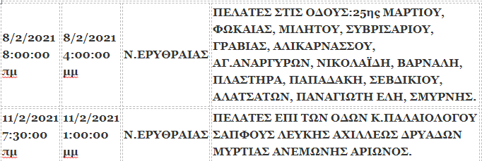 Προγραμματισμένες διακοπές ρεύματος στην Νέα Ερυθραία την Δευτέρα 8/2/21 και Πέμπτη 11/2/21 όπως ανακοίνωσε η ΔΕΔΔΗΕ.