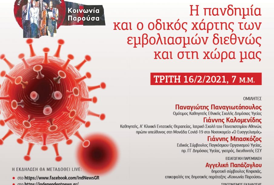 Η δημοτική παράταξη Κοινωνία Παρούσα στην Κηφισιά, Ν. Ερυθραία, Εκάλη διοργανώνει επίκαιρη ενημερωτική διαδικτυακή εκδήλωση με θέμα: «Η πανδημία και ο οδικός χάρτης των εμβολιασμών διεθνώς και στη χώρα μας» την Τρίτη 16 Φεβρουαρίου 2021, ώρα: 19.00.