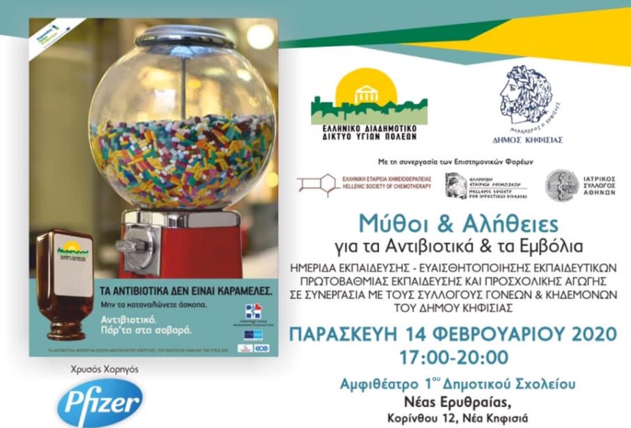 Ο Δήμος Κηφισιάς, μέλος του Ελληνικού Δικτύου Υγιών Πόλεων του Π.Ο.Υ., και το Ελληνικό Διαδημοτικό Δίκτυο Υγιών Πόλεων διοργανώνουν, στο πλαίσιο της Πανελλήνιας Εκστρατείας ευαισθητοποίησης και ενημέρωσης του πληθυσμού για την ορθή χρήση των αντιβιοτικών, Ημερίδα εκπαίδευσης και ευαισθητοποίησης των Εκπαιδευτικών Προσχολικής Αγωγής και Πρωτοβάθμιας Εκπαίδευσης, την Παρασκευή 14/02/2020 και ώρες 17:00 – 20:00 στο Αμφιθέατρο του 1ου Δημοτικού Σχολείου Νέας Ερυθραίας ( Κορίνθου 12, Νέα Κηφισιά ).