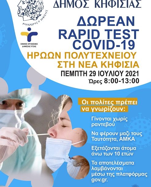 Tην Πέμπτη 29 Ιουλίου 2021, από τις 8:00 έως τις 13:00, κινητή μονάδα του ΕΟΔΥ θα βρίσκεται στην Πλατεία Ηρώων Πολυτεχνείου Νέας Κηφισιάς (Ηρ. Πολυτεχνείου 4, Κηφισιά)  για τη διενέργεια  δωρεάν rapid test Covid-19. Οι δωρεάν έλεγχοι ταχείας ανίχνευσης αντιγόνου πραγματοποιούνται από το Δήμο Κηφισιάς σε συνεργασία με τον Εθνικό Οργανισμό Δημόσιας Υγείας.