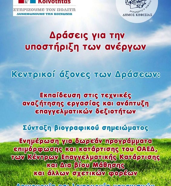 Οι Δράσεις με σκοπό την υποστήριξη των ανέργων ωφελούμενων του Κέντρου Κοινότητας του Δήμου Κηφισιάς εντάσσονται στο πλαίσιο πρωτοβουλιών του Δημάρχου κ.Γιώργου Θωμάκου, για την ανάπτυξη συμβουλευτικών δράσεων προς τους ανέργους και προώθηση ίσων ευκαιριών πρόσβασης στην αγορά εργασίας. Την οργάνωση και επίβλεψη των δράσεων ανέλαβε ο Αντιδήμαρχος Κηφισιάς, Επιχειρηματικότητας και Διεθνών Σχέσεων κ.Γιάννης Παντελεάκης, με τη σημαντική συμβολή της Διεύθυνσης Επιχειρηματικότητας και Πληροφορικής υπό την εποπτεία του Διευθυντή της κ.Αλέξανδρου Σουλαχάκη.
