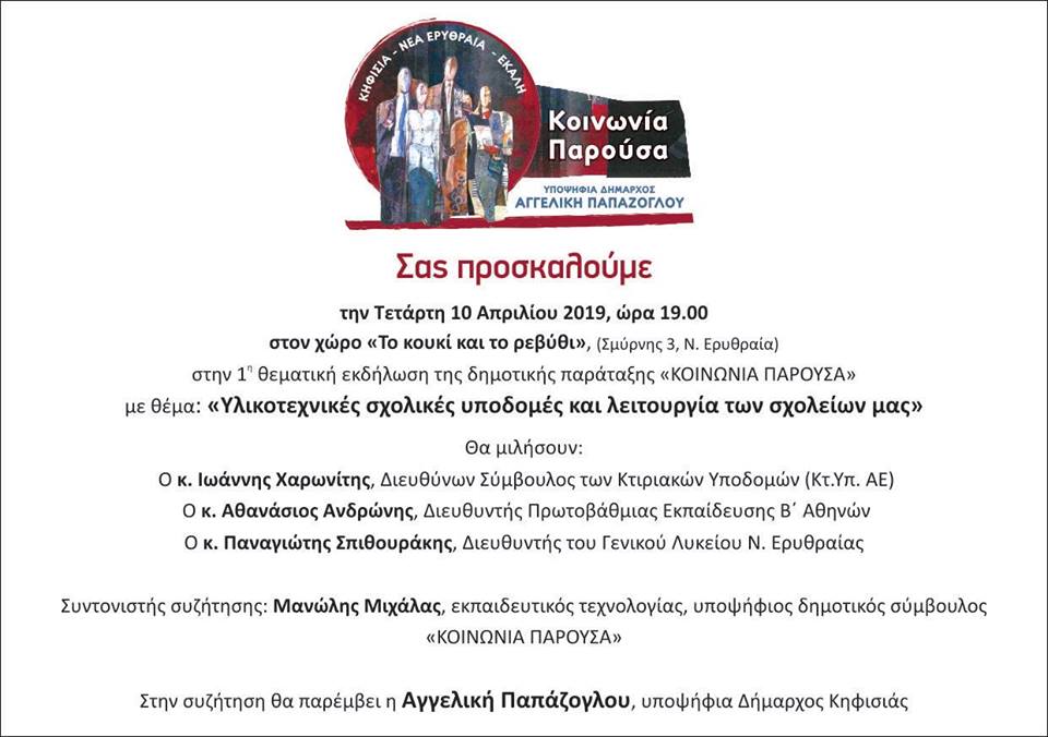 1η Θεματική εκδήλωση της δημοτικής παράταξης του Δήμου Κηφισιάς,«ΚΟΙΝΩΝΙΑ ΠΑΡΟΥΣΑ», με θέμα: «Υλικοτεχνικές σχολικές υποδομές και λειτουργία των σχολείων μας» την Τετάρτη 10 Απριλίου