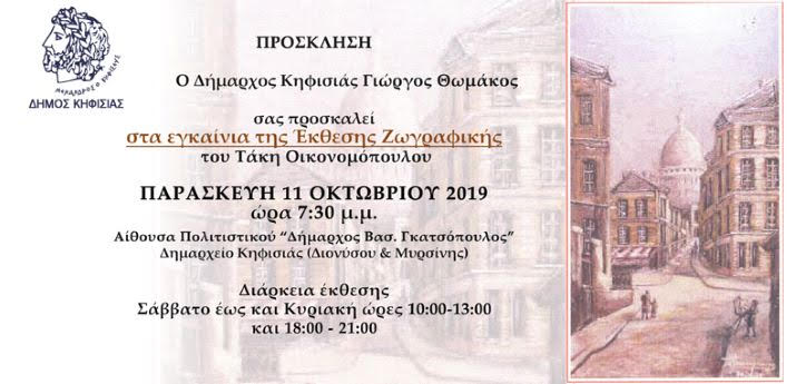 Τα εγκαίνια της Έκθεσης Ζωγραφικής του παλαίμαχου ποδοσφαιριστή Τάκη Οικονομόπουλου θα διεξαχθούν την Παρασκευή 11 Οκτωβρίου 2019 και ώρα 7:30 μ.μ. στην Αίθουσα Πολιτιστικού «Δήμαρχος Βασ. Γκατσόπουλος» στο Δημαρχείο Κηφισιάς (Διονύσου & Μυρσίνης)