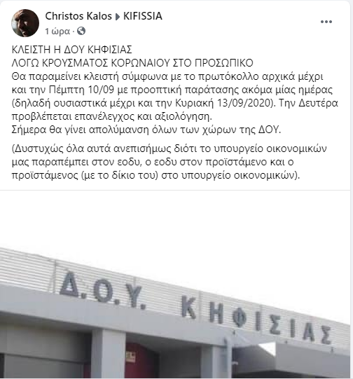 Η ΔΟΥ θα παραμείνει κλειστή σύμφωνα με το πρωτόκολλο του ΕΟΔΥ αρχικά μέχρι και την Πέμπτη 10/09 με προοπτική παράτασης ακόμα μίας ημέρας. Την Δευτέρα προβλέπεται επανέλεγχος και αξιολόγηση.