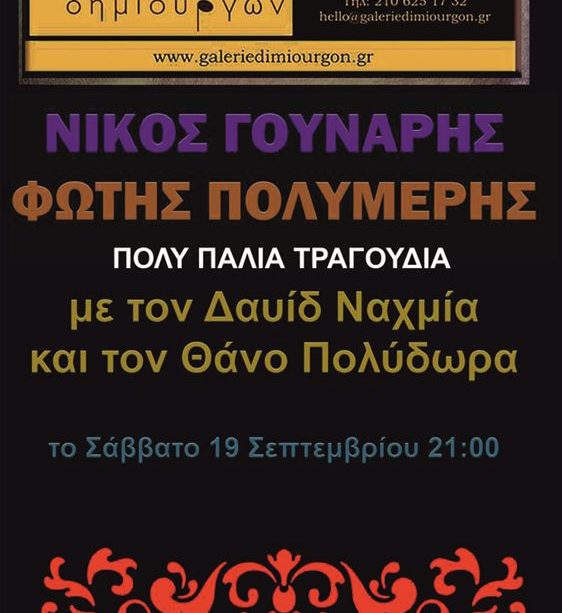 Το Σάββατο 19 Σεπτεμβρίου στις 21:00, η Galerie Δημιουργών παρουσιάζει ένα αφιέρωμα στα τραγούδια του Νίκου Γούναρη με την ευκαιρία των 55 χρόνων απ’ το θάνατό του και του Φώτη Πολυμέρη με την ευκαιρία των 100 χρόνων απ’ τη γέννησή του.