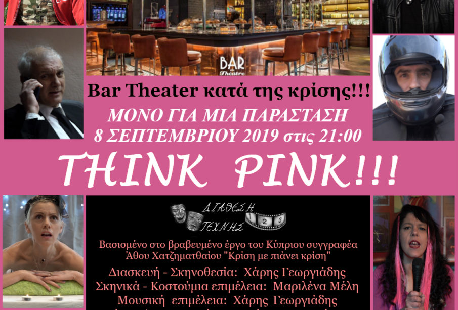 Η αστική μη κερδοσκοπική εταιρεία θεάτρου «ΔΙΑΘΕΣΗ ΤΕΧΝΗΣ», παρουσιάζει την Κυριακή 08 Σεπτεμβρίου στις 21:00, στον πολυχώρο Galerie Δημιουργών, για μία μόνο παράσταση την κοινωνική κωμωδία «Think Pink», βασισμένη στο βραβευμένο έργου του Κύπριου θεατρικού συγγραφέα Άθου Χατζηματθαίου «Κρίση με πιάνει κρίση», υπό την αιγίδα του Ομίλου για την UNESCO Πειραιώς και Νήσων.