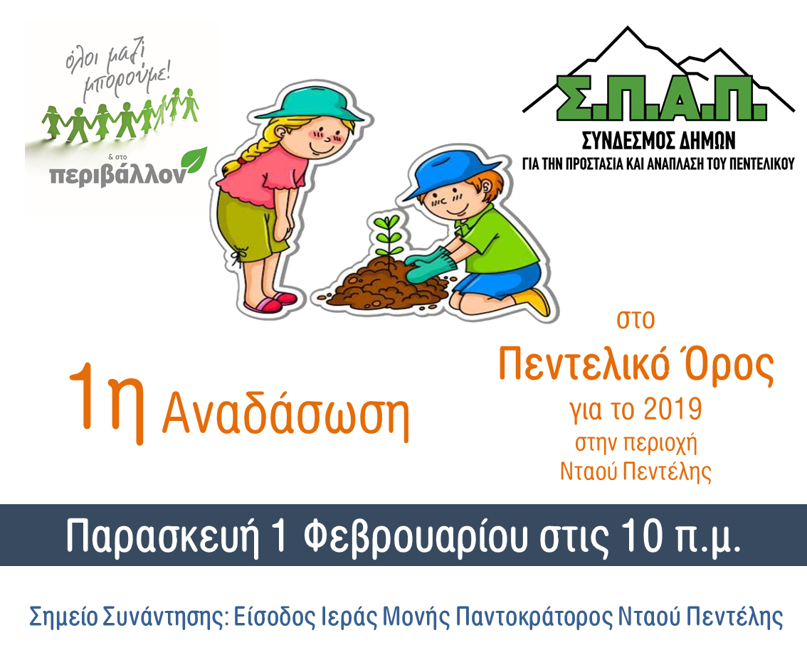 Ο Σύνδεσμος Δήμων για την Προστασία και Ανάπλαση του Πεντελικού (Σ.Π.Α.Π.), σε συνεργασία με το «Όλοι Μαζί Μπορούμε και στο Περιβάλλον» διοργανώνει Mαθητική Aναδάσωση, η οποία θα πραγματοποιηθεί στη Νταού Πεντέλης την Παρασκευή 1 Φεβρουαρίου 2019 και ώρα 10 π.μ. Πρόκειται για την 1η Δράση Αναδάσωσης του Συνδέσμου για το 2019, η οποία ήταν προγραμματισμένη να πραγματοποιηθεί στις 25 Ιανουαρίου, αλλά αναβλήθηκε λόγω της κακοκαιρίας που επικρατούσε τη συγκεκριμένη ημέρα και κατέστησε αδύνατη την πραγματοποίηση της.