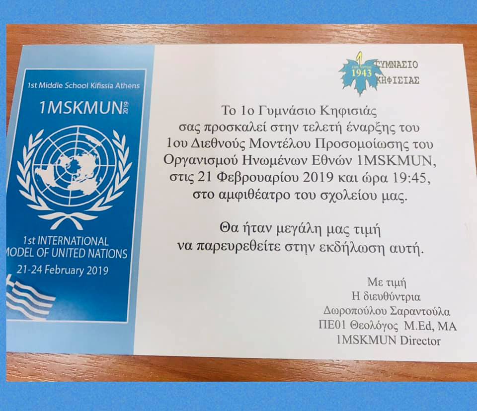 Το 1ο Γυμνάσιο Κηφισιάς σας προσκαλεί στην τελετή έναρξης του 1ου Διεθνούς Μοντέλου Προσομοίωσης του Οργανισμού Ηνωμένων Εθνών, 1MSKMUN, την Πέμπτη 21 Φεβρουαρίου 2019 και ώρα 19.45 στο αμφιθέατρο του σχολείου.