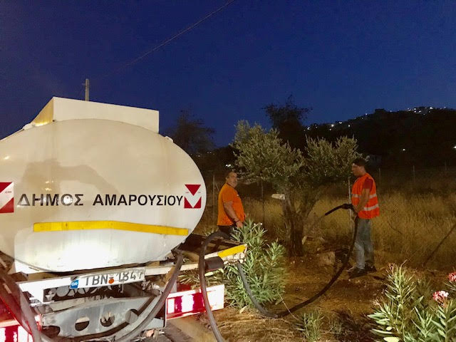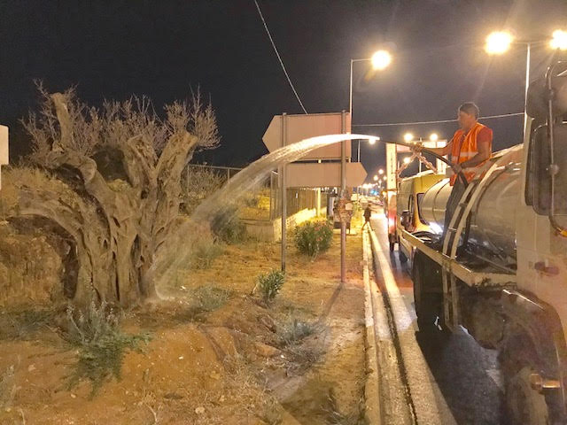 Με πρωτοβουλία του Δήμου Αμαρουσίου ποτίστηκαν τα περίπου 60 ελαιόδεντρα που είχαν φυτευτεί το Νοέμβριο του 2018 στα πλάγια της Λεωφόρου Μαραθώνος, στο ύψος που η πύρινη λαίλαπα κατέκαψε τα πάντα στο πέρασμα της.