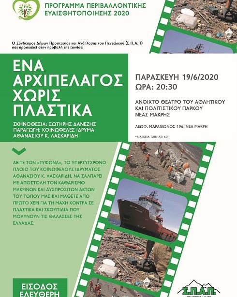 Ο Σύνδεσμος Δήμων Προστασίας και Ανάπλασης του Πεντελικού (Σ.Π.Α.Π) και η Κοινωφελής Επιχείρηση Δήμου Μαραθώνος (Κ.Ε.Δ.ΜΑ), στα πλαίσια του Προγράμματος Περιβαλλοντικής Ευαισθητοποίησης 2020, σας προσκαλούν στην προβολή της ταινίας: ΕΝΑ ΑΡΧΙΠΕΛΑΓΟΣ ΧΩΡΙΣ ΠΛΑΣΤΙΚA, που θα πραγματοποιηθεί την ΠΑΡΑΣΚΕΥΗ 19 ΙΟΥΝΙΟΥ 2020, στις 20:30, στο Αμφιθέατρο του Αθλητικού και Πολιτιστικού Πάρκου Νέας Μάκρης.