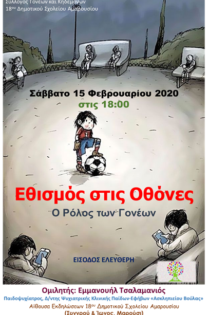 Εκδήλωση -ομιλία για τον εθισμό στις οθόνες και τον ρόλο των γονέων θα διεξαχθεί στο 18ο Δημοτικό Σχολείο Αμαρουσίου (οργάνωση: Σύλλογος Γονέων και Κηδεμόνων 18ου Δημοτικού Σχολείου Αμαρουσίου).
