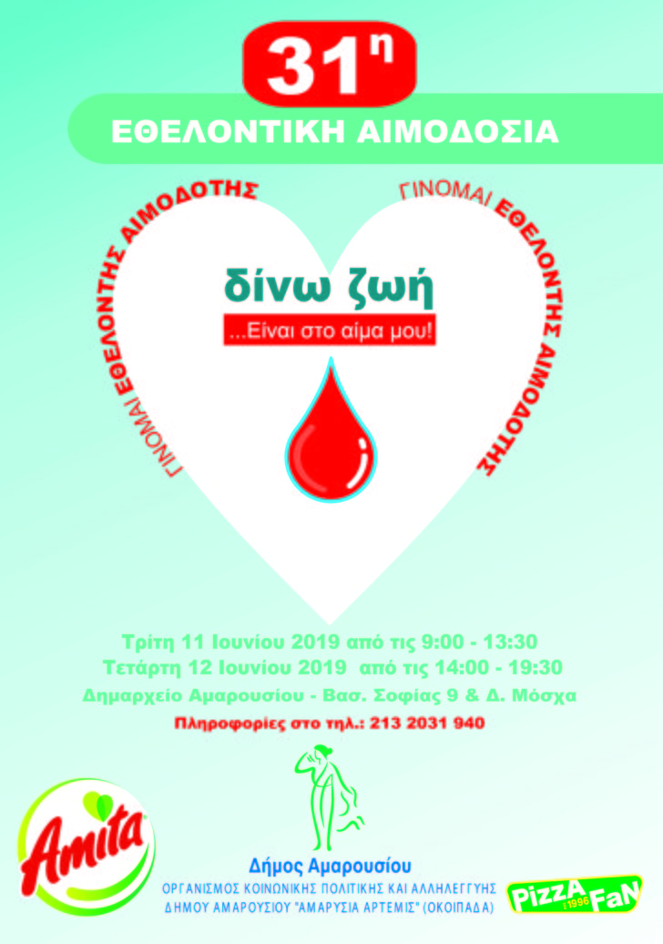 Η 31η εθελοντική αιμοδοσία θα πραγματοποιηθεί στο Δημαρχείο Αμαρουσίου (Βασ. Σοφίας 9 & Δ. Μόσχα) τις ακόλουθες ημέρες και ώρες: