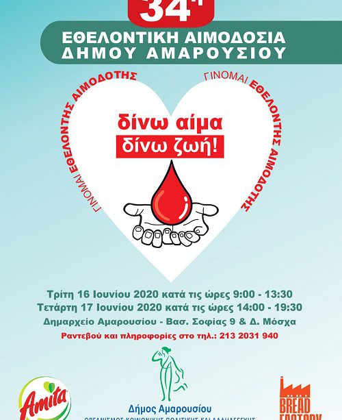34η Εθελοντική Αιμοδοσία στο Δήμο Αμαρουσίου //16 & 17 Ιουνίου 2020, Δημαρχείο Αμαρουσίου