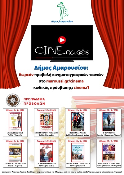 Τις ταινίες μπορούν να απολαύσουν οι Μαρουσιώτες στην ιστοσελίδα του Δήμου και συγκεκριμένα στη δνση: https://maroussi.gr/cinema χρησιμοποιώντας τον κωδικό πρόσβασης: cinema1. Την ημερομηνία έναρξης της προβολής της κάθε ταινίας θα ενεργοποιείται και το σχετικό link.