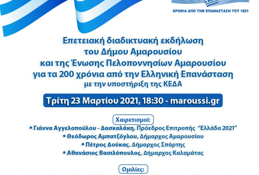 Ο Δήμος Αμαρουσίου και η Ένωση Πελοποννησίων Αμαρουσίου διοργανώνουν με την υποστήριξη της Κοινωφελούς Επιχείρησης του Δήμου (ΚΕΔΑ), Επετειακή διαδικτυακή εκδήλωση για τα 200 χρόνια από την Ελληνική Επανάσταση την Τρίτη 23 Μαρτίου 2021 και ώρα 18:30.