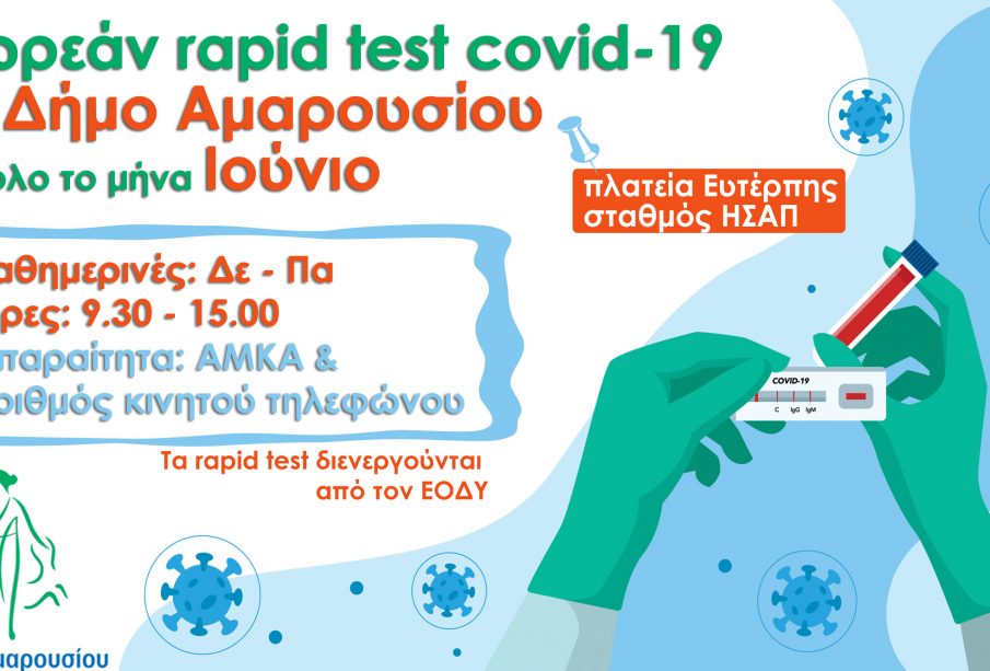 Ανακοινώνεται πως σε συνέχεια ενεργειών του Δημάρχου Αμαρουσίου Θεόδωρου Αμπατζόγλου, στην πλατεία ΗΣΑΠ θα διενεργούνται εκτός από τον Μάϊο και για όλο τον μήνα Ιούνιο, από τις Κινητές Ομάδες Υγείας (ΚΟΜΥ) του ΕΟΔΥ τα τεστ ταχείας ανίχνευσης για covid-19, προσφέροντας παράλληλα και συμβουλευτικές υπηρεσίες για τα self test.