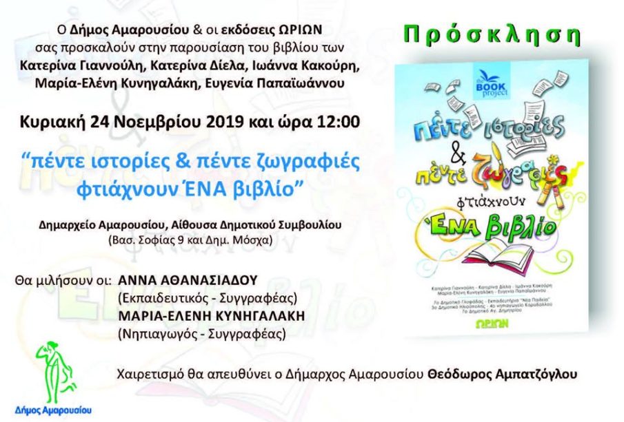 Ο Δήμος Αμαρουσίου και οι εκδόσεις Ωρίων (www.orionbooks.gr) σας προσκαλούν στην παρουσίαση του βιβλίου “Πέντε ιστορίες και πέντε ζωγραφιές φτιάχνουν ένα βιβλίο” την Κυριακή 24 Νοεμβρίου 2019 και ώρα 12.00 στο Δημαρχείο Αμαρουσίου (Αίθουσα Δημοτικού Συμβουλίου, Βασ. Σοφίας 9 και Δημ. Μόσχα).