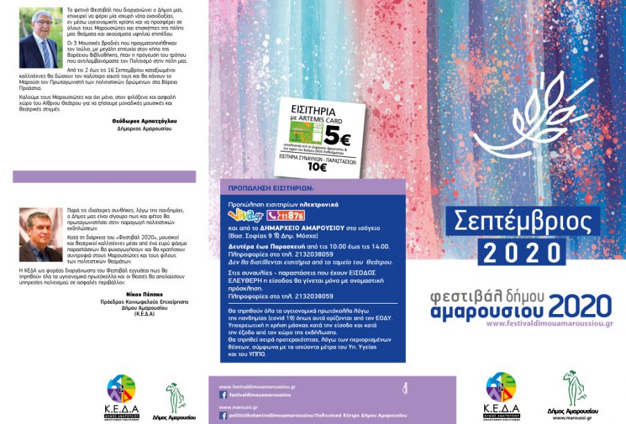 «Με 12 ξεχωριστές βραδιές ο Δήμος Αμαρουσίου, επιχειρεί να φέρει μία ισχυρή νότα αισιοδοξίας, εν μέσω υγειονομικής κρίσης και να προσφέρει θεάματα και ακούσματα υψηλού επιπέδου. Καταξιωμένοι καλλιτέχνες θα δώσουν τον καλύτερο εαυτό τους και θα κάνουν το Μαρούσι τον Πρωταγωνιστή των πολιτιστικών δρώμενων στα Βόρεια Προάστια» αναφέρει στο μήνυμά του ο Δήμαρχος Θεόδωρος Αμπατζόγλου.
