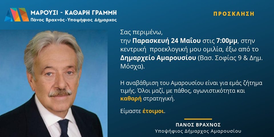 Την Παρασκευή 24/5 η Κεντρική Προεκλογική Ομιλία του Πάνου Βραχνού