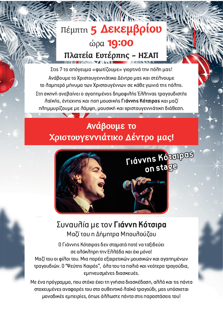 Ο Δήμαρχος Αμαρουσίου Θεόδωρος Αμπατζόγλου δίνει το έναυσμα της έναρξης των ιδιαίτερων και ποιοτικών εορταστικών εκδηλώσεων, την Πέμπτη 5 Δεκεμβρίου 2019, στις 7 το απόγευμα, στην Πλατεία Ευτέρπης με το άναμμα του Χριστουγεννιάτικου Δέντρου. Στη σκηνή ανεβαίνει ο αγαπημένος δημοφιλής Έλληνας τραγουδιστής, λαϊκής, έντεχνης και ποπ μουσικής Γιάννης Κότσιρας, που μαζί με την Δήμητρα Μπουλούζου, υπόσχονται να απογειώσουν το κέφι και τη Χριστουγεννιάτικη διάθεση.