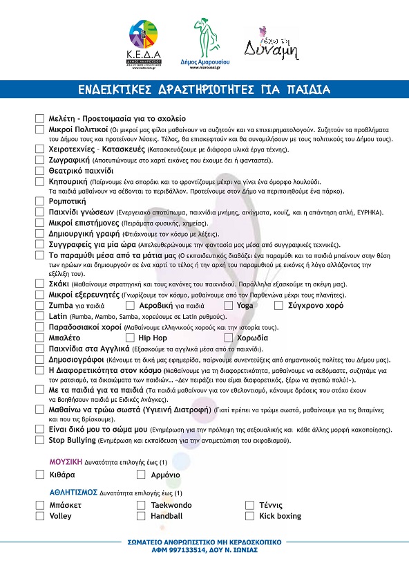 Το πρόγραμμα δημιουργικής απασχόλησης απευθύνεται σε παιδιά ηλικίας από 5 έως 12 ετών του Δήμου Αμαρουσίου και εκπονείται από την Κοινωφελή Επιχείρηση του Δήμου (Κ.Ε.Δ.Α.), σε συνεργασία με τον Ανθρωπιστικό μη Κερδοσκοπικό Σωματείο «ΕΧΩ ΤΗ ΔΥΝΑΜΗ».
