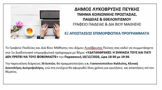Το Γραφείο Παιδείας και Διά Βίου Μάθησης του Δήμου Λυκόβρυσης Πεύκης σας καλεί να συμμετάσχετε στο 1ο Διαδικτυακό επιμορφωτικό πρόγραμμα με θέμα: «ΥΔΑΤΑΝΘΡΑΚΕΣ: Η ΣΗΜΑΣΙΑ ΤΟΥΣ ΚΑΙ ΓΙΑΤΙ ΔΕΝ ΠΡΕΠΕΙ ΝΑ ΤΟΥΣ ΦΟΒΟΜΑΣΤΕ» την Παρασκευή 18/12/2020, ώρα 18:30 με 19:30.
