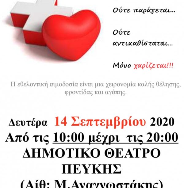 Για τη Δευτέρα 14 Σεπτεμβρίου είναι προγραμματισμένη η Εθελοντική Αιμοδοσία που διοργανώνει ο Δήμος Λυκόβρυσης- Πεύκης. Θα πραγματοποιηθεί στην Αίθουσα «Μανόλης Αναγνωστάκης» (Χρυσοστόμου Σμύρνης & Ρήγα Φεραίου) από τις 10:00 π.μ. ως τις 8:00 μμ. και έχει ως στόχο την ενίσχυση της Δημοτικής Τράπεζας Αίματος. Θα τηρηθούν τα απαιτούμενα μέτρα προστασίας που ισχύουν για την προστασία από τον κορωνοϊό, όπως συνέβη και στην εθελοντική αιμοδοσία που οργανώθηκε στον ίδιο χώρο τον Μάρτιο.