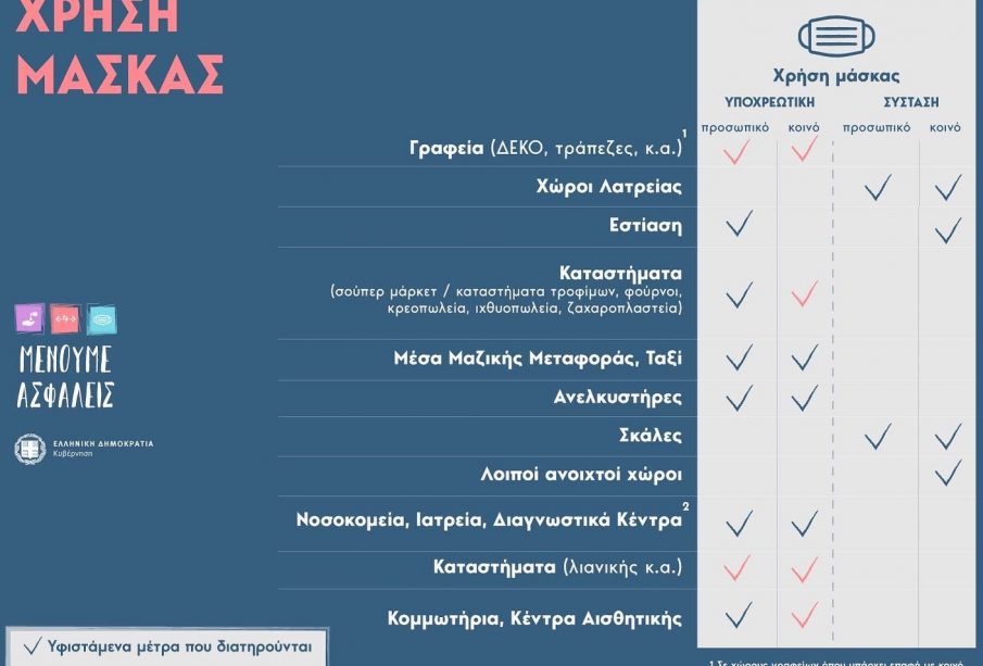 Σύμφωνα με την τελευταία απόφαση με σκοπό τον περιορισμό της εξάπλωσης του κορωνοϊού COVID-19(ΦΕΚ 3131/28-7-2020), η χρήση της μάσκας είναι υποχρεωτική σε όλους τους χώρους συνάθροισης κοινού, μεταξύ αυτών και στους δημοτικούς χώρους. Το μέτρο αυτό τίθεται σε ισχύ από την Τετάρτη 29 Ιουλίου 2020 και συνεπώς εργαζόμενοι σε κλειστούς χώρους γραφείων που υποδέχονται κοινό σε Δήμο, ΚΕΠ και δημοτικές δομές, καθώς και οι επισκέπτες οφείλουν να φορούν τις προβλεπόμενες μάσκες.