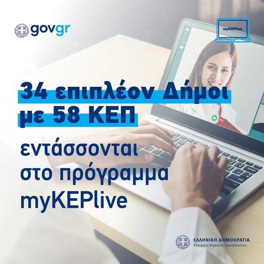 Συνεχίζεται η επέκταση του προγράμματος myKEPlive καθώς 34 επιπλέον Δήμοι, στην περιφέρεια των οποίων λειτουργούν 58 ΚΕΠ, εντάσσονται στην πλατφόρμα του Υπουργείου Ψηφιακής Διακυβέρνησης. Έτσι, τα ΚΕΠ που εξυπηρετούν τους πολίτες με βιντεοκλήσεις ανέρχονται πλέον σε 133 και οι Δήμοι στους οποίους υπάγονται σε 96.