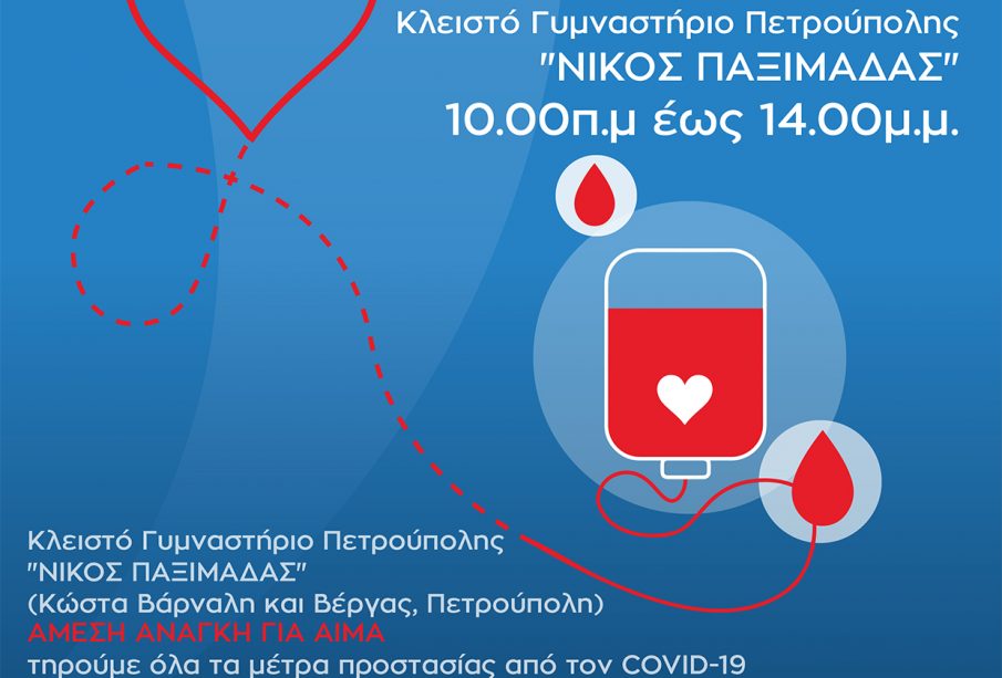 Η Περιφέρεια Αττικής, σε συνεργασία με το “Όλοι Μαζί Μπορούμε’’, τον Ιατρικό Σύλλογο Αθηνών και με τη στήριξη του Ποδηλατικού Δρομικού Συλλόγου Οδυσσέας Πετρούπολης και της Αντιπεριφέρειας Δυτικού τομέα Αθηνών την Κυριακή 14 Φεβρουαρίου, οργανώνει εθελοντική αιμοδοσία στο Κλειστό Γυμναστήριο Πετρούπολης «ΝΙΚΟΣ ΠΑΞΙΜΑΔΑΣ» (Κώστα Βάρναλη και Βέργας Πετρούπολη).