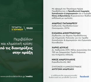 H Εθνική Λυρική Σκηνή, στο πλαίσιο της επαναλειτουργίας των ζωντανών θεαμάτων σε ανοιχτούς χώρους και βάσει των υγειονομικών πρωτοκόλλων, ανακοινώνει το επικαιροποιημένο ...Εκδήλωση Νίκου Ανδρουλάκη για την Παγκόσμια Ημέρα Περιβάλλοντος την Τετάρτη 2/6