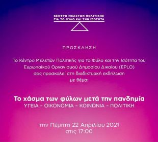 Διαδικτυακή εκδήλωση με τίτλο «Το χάσμα των φύλων μετά την πανδημία» διοργανώνει την Πέμπτη 22 Απριλίου, στις 17.00, το Κέντρο Μελετών Πολιτικής ...