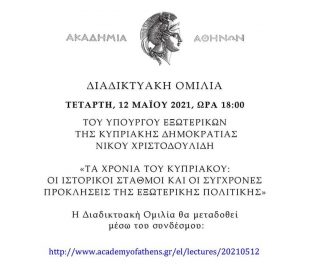 Διαδικτυακή Ομιλία του Υπουργού Εξωτερικών της Κυπριακής Δημοκρατίας κ. Νίκου Χριστοδουλίδη «Τα χρόνια του Κυπριακού: Οι ιστορικοί σταθμοί και οι σύγχρονες προκλήσεις ...Γιώργος Νταλάρας: «Ο γύρος του κόσμου με ελληνικά τραγούδια» «Περπάτησα όλη τη γη..»
