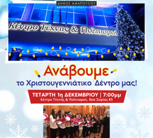 Τετάρτη 1η Δεκεμβρίου 2021, ώρα 7:00 μ.μ., Κέντρο Τέχνης και Πολιτισμού Σε εορταστικούς ρυθμούς η Κοινωφελής Επιχείρηση του Δήμου Αμαρουσίου, ανάβει το ...“ΜΙΚΡΕΣ ΕΚΠΛΗΞΕΙΣ ΙΙΙ” – Ομαδική Εικαστική Έκθεση στο ιστορικό χώρο του ΕΛΛΗΝΟΓΑΛΛΙΚΟΥ ΣΥΝΔΕΣΜΟΥ στο ...