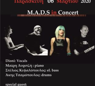 Ο Δήμος Διονύσου και η Αντιδημαρχία Πολιτισμού στο πλαίσιο του εορτασμού της “Ημέρας της Γυναίκας”, διοργανώνει το Σαββατοκύριακο 7 & 8 Μαρτίου ...΄΄M.A.D.S. in concert΄΄την Παρασκευή 6 Mαρτίου στην Galerie Δημιουργών