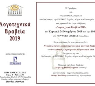 Η σχετική ανακοίνωση: Έλα και εσύ μαζί μας, για να κάνουμε μία νέα αρχή με μία ευχή που θα ριζώσει βαθιά ...“Λογοτεχνικά Βραβεία 2019” του 8ου Διεθνούς Λογοτεχνικού Διαγωνισμού 2019 Κυριακή 24 Νοεμβρίου 2019